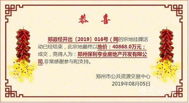 郑政经开出〔2019〕016号(网)最终被郑州保利亨业房地产开发有限公司以40868万元竞得,折合单位地价824.15万元/亩,楼面地价4945元/㎡。