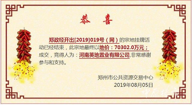 郑政经开出[2019]019号(网)地块最终被河南英地置业有限公司,以70302万元竞得,折合单位地价1075.07万元/亩,楼面地价4607元/㎡。