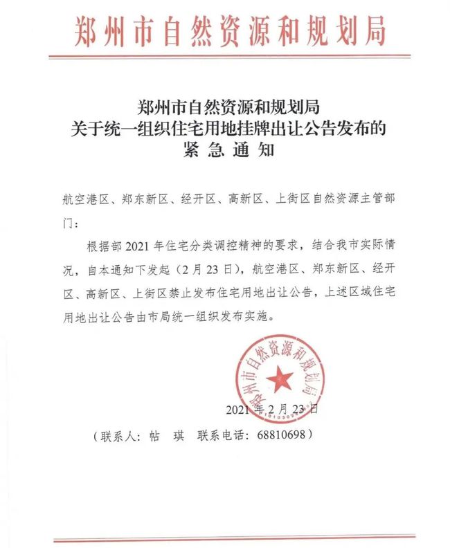 郑州通知称,根据部2021年住宅分类调控精神的要求,结合郑州市实际情况,自本通知下发起(2月23日),航空港区、郑东新区、经开区、高新区、上街区禁止发布住宅用地出让公告,上述区域住宅用地出让公告由市局统一组织发布实施。(网传文件截图,截止到发稿时并未正式公布)