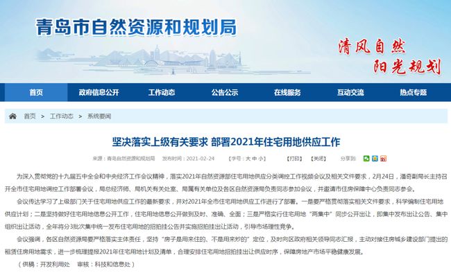 2月24日,山东省青岛市自然资源和规划局官网发布《坚决落实上级有关要求 部署2021年住宅用地供应工作》的通知。